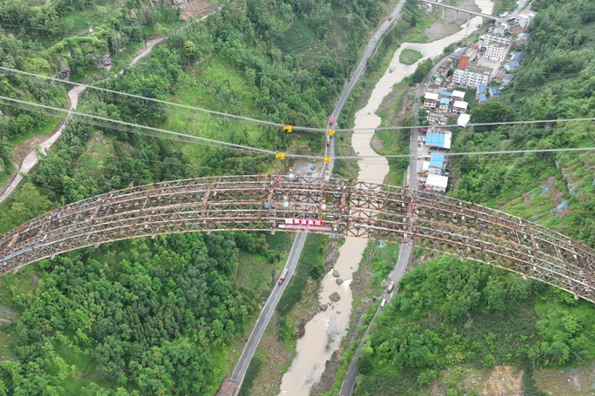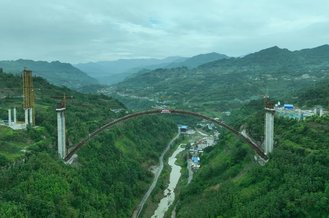 蘇壩特大橋具有“三大”特點:一是施工難度大,主橋施工采用無支架纜索吊裝工藝,且施工區(qū)域位于陡崖地段,主橋跨越國道及縣道,施工組織難度大、風(fēng)險高;二是施工作業(yè)面高,作業(yè)面距河面近300米,相當(dāng)于100層樓的高度,施工期間還面臨山區(qū)極端氣候影響;三是合龍精度高,通過精細(xì)化有限元模型仿真計算及全過程高精度測量控制,合龍段軸線誤差控制在5毫米以內(nèi),高程控制在7毫米以內(nèi),實現(xiàn)了勁性骨架高精度合龍。