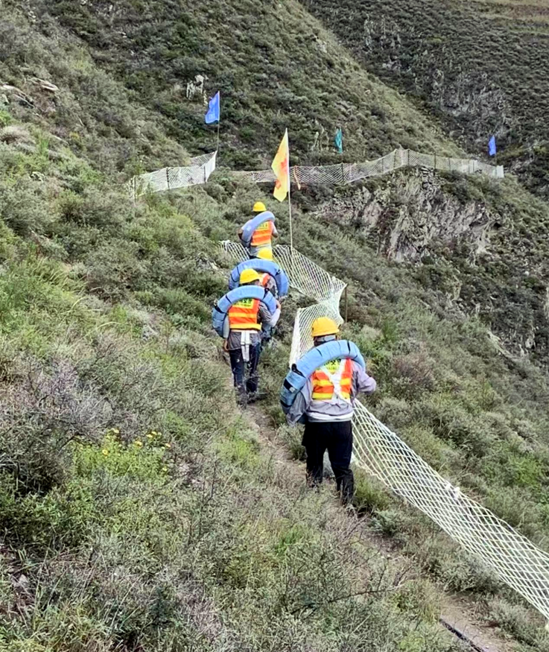 該滑坡點距地面垂直距離300余米,施工面窄,材料無法通過機械設(shè)備運輸至施工現(xiàn)場,給搶險工作帶來了較大影響。為及時解決滑坡帶來的安全隱患,突擊隊第一時間制定了科學(xué)合理的搶險方案,青年黨員們更是組成了一支“先行隊”,不懼艱險,徒步向山頂運送安全繩、錨桿、鋼筋等材料,同時在滑坡面開展人工清危并鋪設(shè)防護網(wǎng)、噴射砼進行防護。