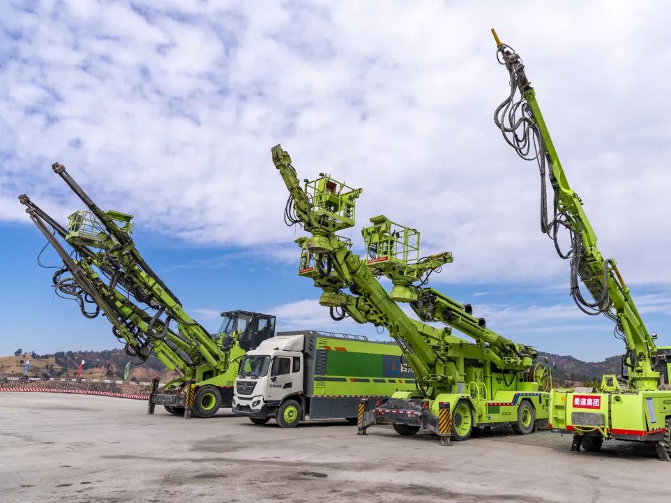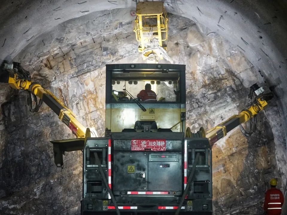 其中,隧道建設(shè)中的“變形金剛”起到了至關(guān)重要的作用。川隧人在機(jī)械化、智能化方面先行先試、大膽探索,使用了全電腦版三臂鑿巖臺(tái)車、多功能智能拱架安裝臺(tái)車、智能濕噴機(jī)械手、智能拱錨噴一體化臺(tái)車、自行式中央水溝蓋板預(yù)制安裝臺(tái)車、智能化二襯澆筑臺(tái)車、遠(yuǎn)程集中指揮車等隧道智能建造中的“黑科技”,還積極推行“油轉(zhuǎn)電”,在行業(yè)內(nèi)率先使用電動(dòng)挖機(jī)、電動(dòng)裝載機(jī)、電動(dòng)運(yùn)渣車、電動(dòng)混凝土罐車、電動(dòng)水車等純電動(dòng)節(jié)能設(shè)備,形成了全套隧道綠色智造工裝體系和可復(fù)制推廣的電動(dòng)工程機(jī)械運(yùn)用模式,實(shí)現(xiàn)了隧道IV、V級(jí)圍巖單循環(huán)施工由16h縮至12h,減人50%,人工成本大幅降低,電動(dòng)設(shè)備較傳統(tǒng)柴油設(shè)備能耗降低了60%~80%,單洞每年可減少碳排放1100噸。