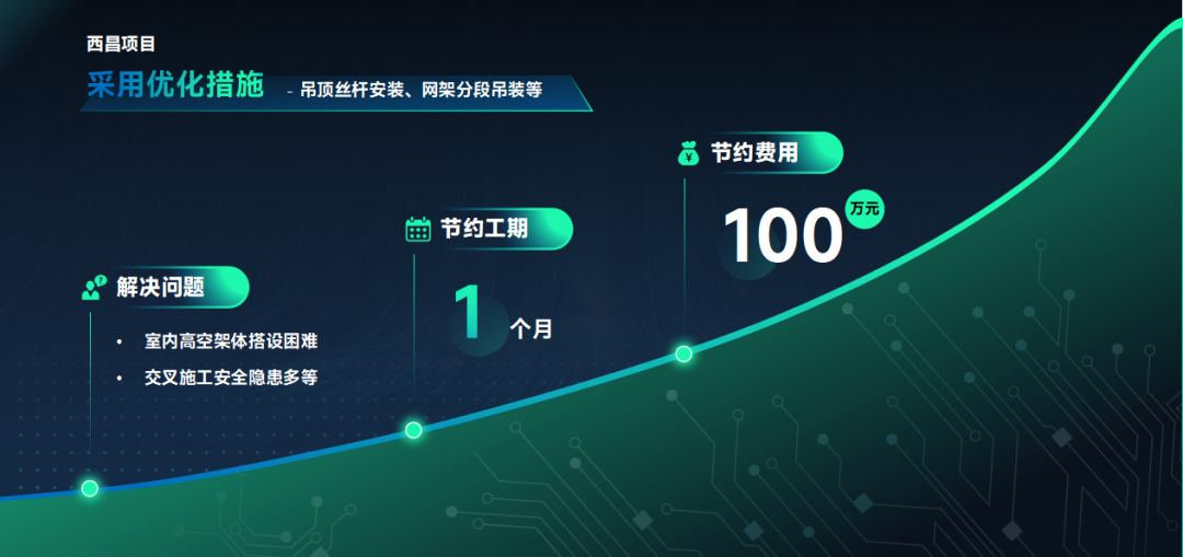 西昌高鐵新城項目采用吊頂絲桿安裝、網(wǎng)架分段吊裝等優(yōu)化措施,既解決了室內(nèi)高空架體搭設(shè)困難、交叉施工安全隱患多等問題,又節(jié)約工期一個月,節(jié)省費用近百萬。